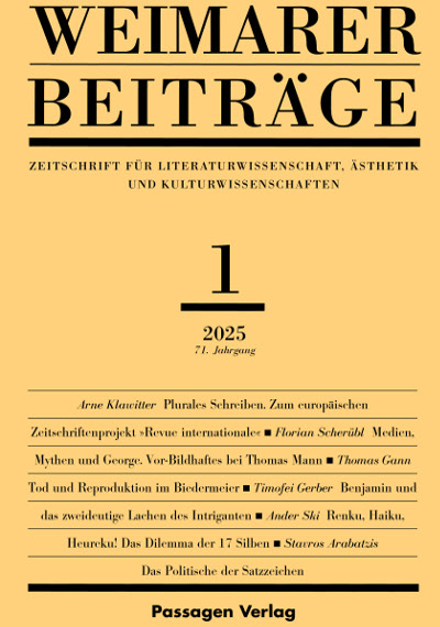 Weimarer Beiträge (Zeitschrift für Literaturwissenschaft, Ästhetik, und Kulturwissenschaften), 1/2025, Passagen Verlag Wien